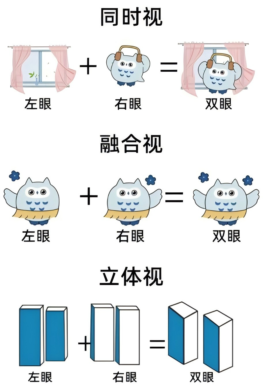 双眼视功能包括同时视(1级),融合视(2级),立体视(3级)。3级视功能同时协作,才能清晰,舒适地看东西。如果3级视功能不能同时协调作用,则有可能是双眼视功能异常,需要进行视功能训练。